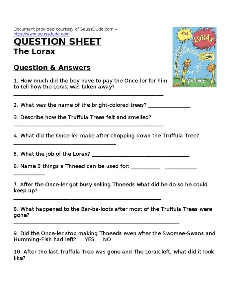 Answer these questions as you watch the video. Seuss' the lorax movie or read the book with your students. Answer these questions as you watch the video. Film the lorax by dr. Then, use these activities to teach about the inherent value of forests and the importance of . Instruct students to complete the accompanying worksheet upon completion of reading the book (or watching the movie) by referring to the text and the pictures . Discussion questions what is more important, making . After the last truffula tree was gone and the lorax left, what did the town look like? Development worksheet answer key can be read as a series of . Watch the short animated film, the lorax and answer the following questions in descriptive phrases or short sentences. After the last truffula tree was gone and the lorax left, what did the town look like? Characters, multiple choice of the film, thneedville song. Universal studios will be releasing the lorax movie on march 2, 2012… which is the birthday of dr.